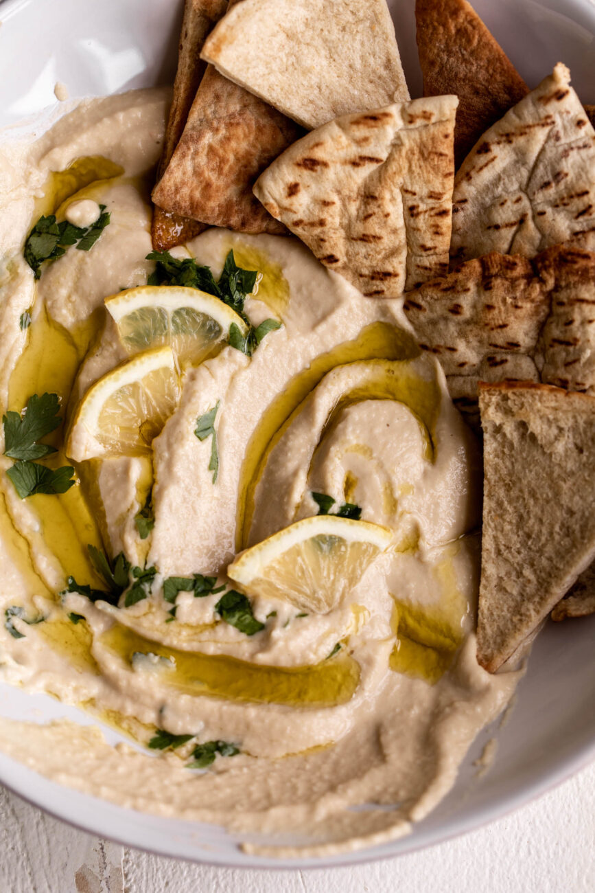 This four-step lemon garlic hummus is a smooth, creamy dip made with chickpeas, tahini, fresh lemon juice, and garlic for a bright, balanced flavor. It’s a classic Middle Eastern-inspired spread that comes together quickly in a food processor and works as both a dip and a versatile condiment. The combination of citrus and garlic enhances the richness of the tahini while keeping the hummus light and fresh. If you love this recipe, pair it with these easy homemade baked pita chips. For a full Mediterranean spread, serve this colorful, crowd-pleasing crudite platter.