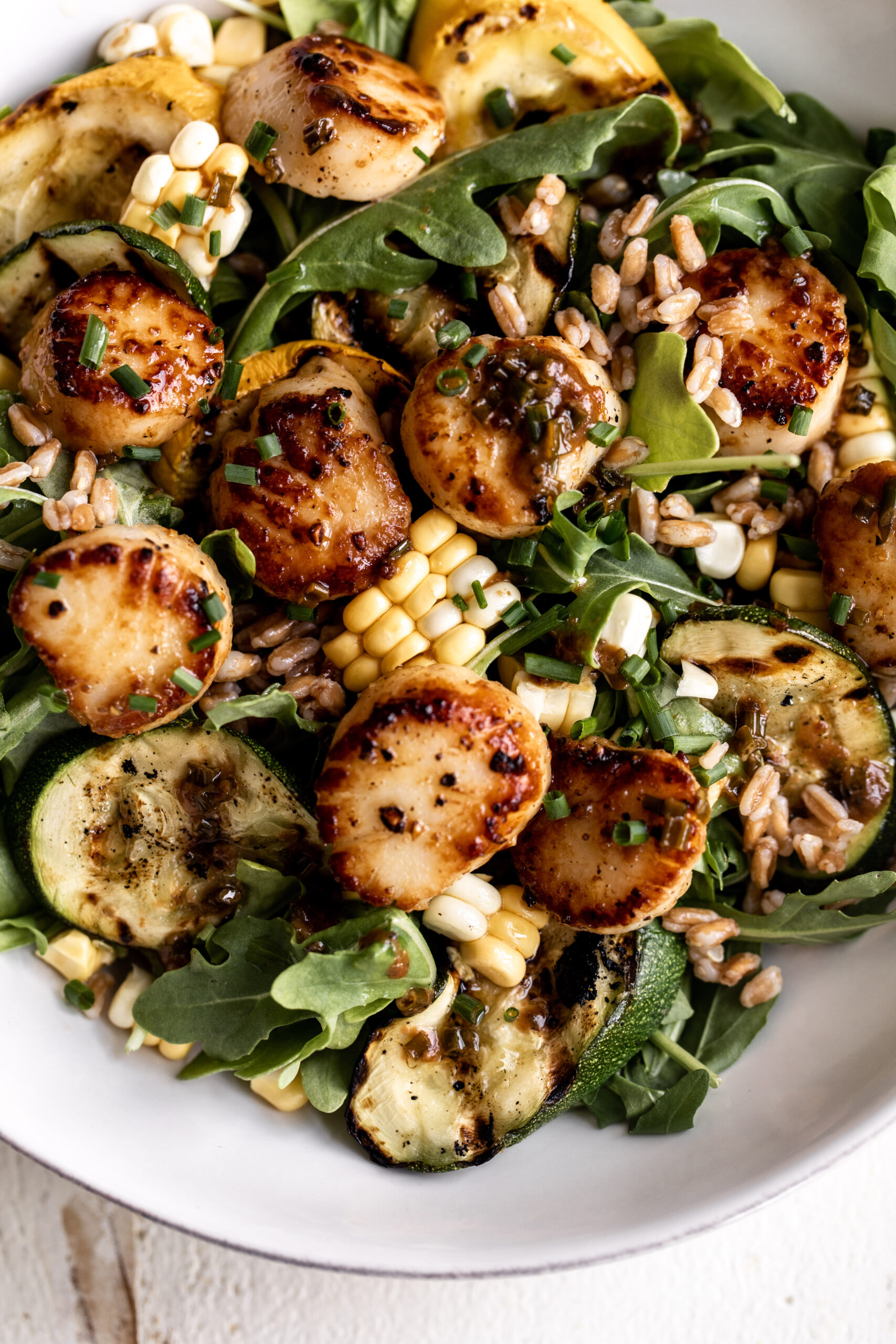 - Divide arugula among serving bowls and top with farro, corn, zucchini and squash. Top each with scallops and drizzle the pan sauce over the top. Garnish with the remaining chives and serve immediately.