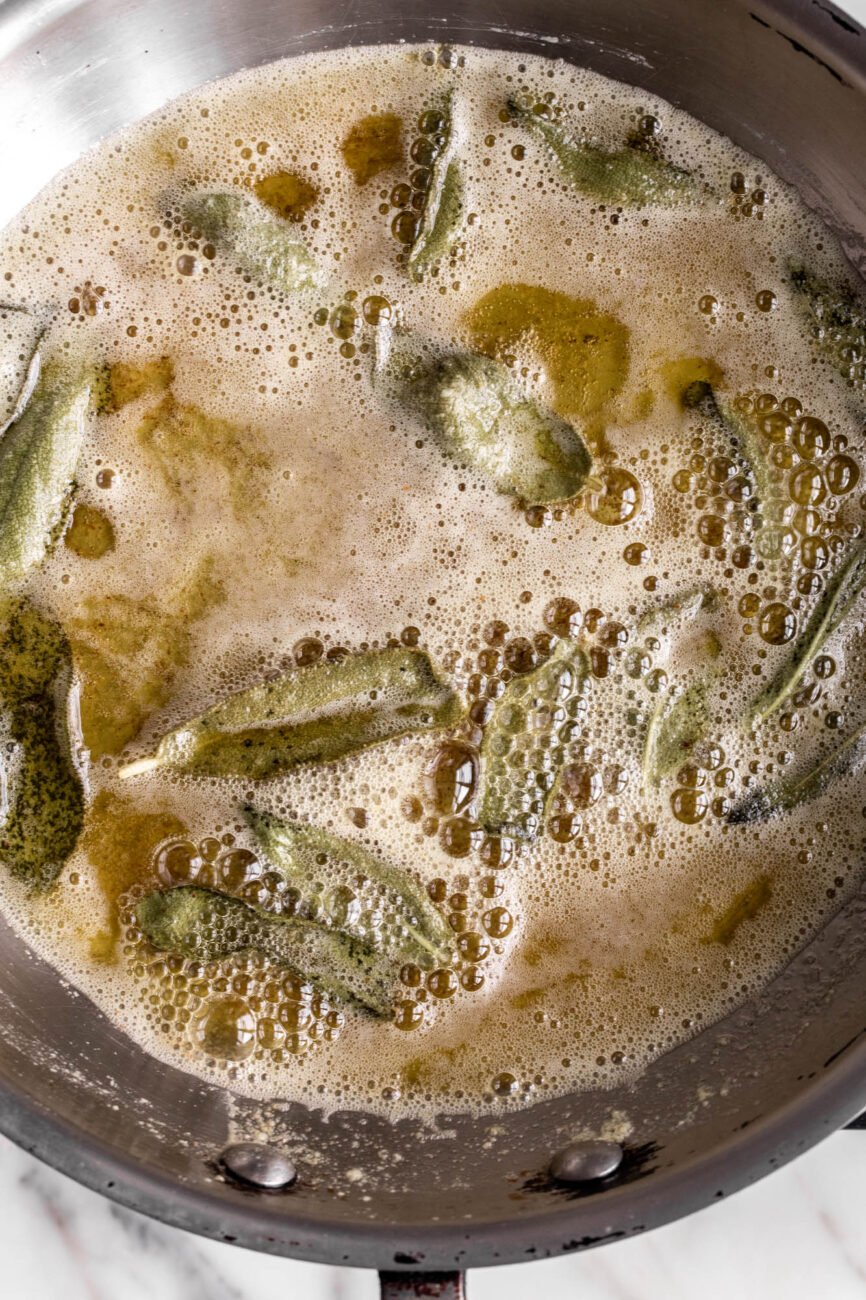 Step 9: Fry the sage. Add the sage then continue to cook the butter, swirling it around the pan occasionally, until the butter is a toasty-brown color and has a nutty aroma, about 5 minutes. Once this happens, immediately remove the brown butter to a small bowl. Set the sage aside on a plate.
