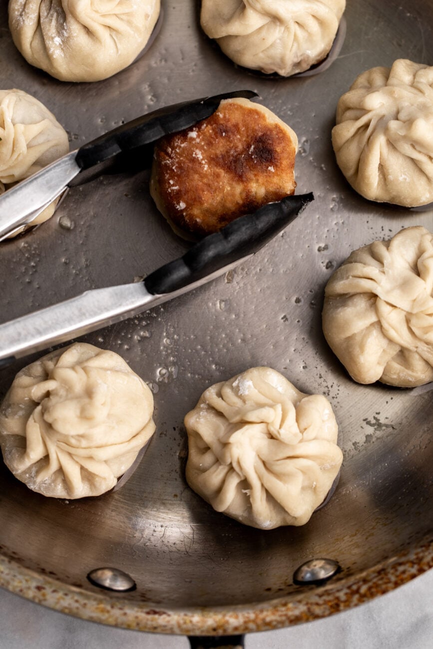- Add ½ cup water to the pan, then cover tightly with a lid (do this quickly, as the liquid will splatter) and cook until most of the liquid has been absorbed and the bottoms of the dumplings are crisp and golden and the meat inside is cooked through, about 7 minutes.