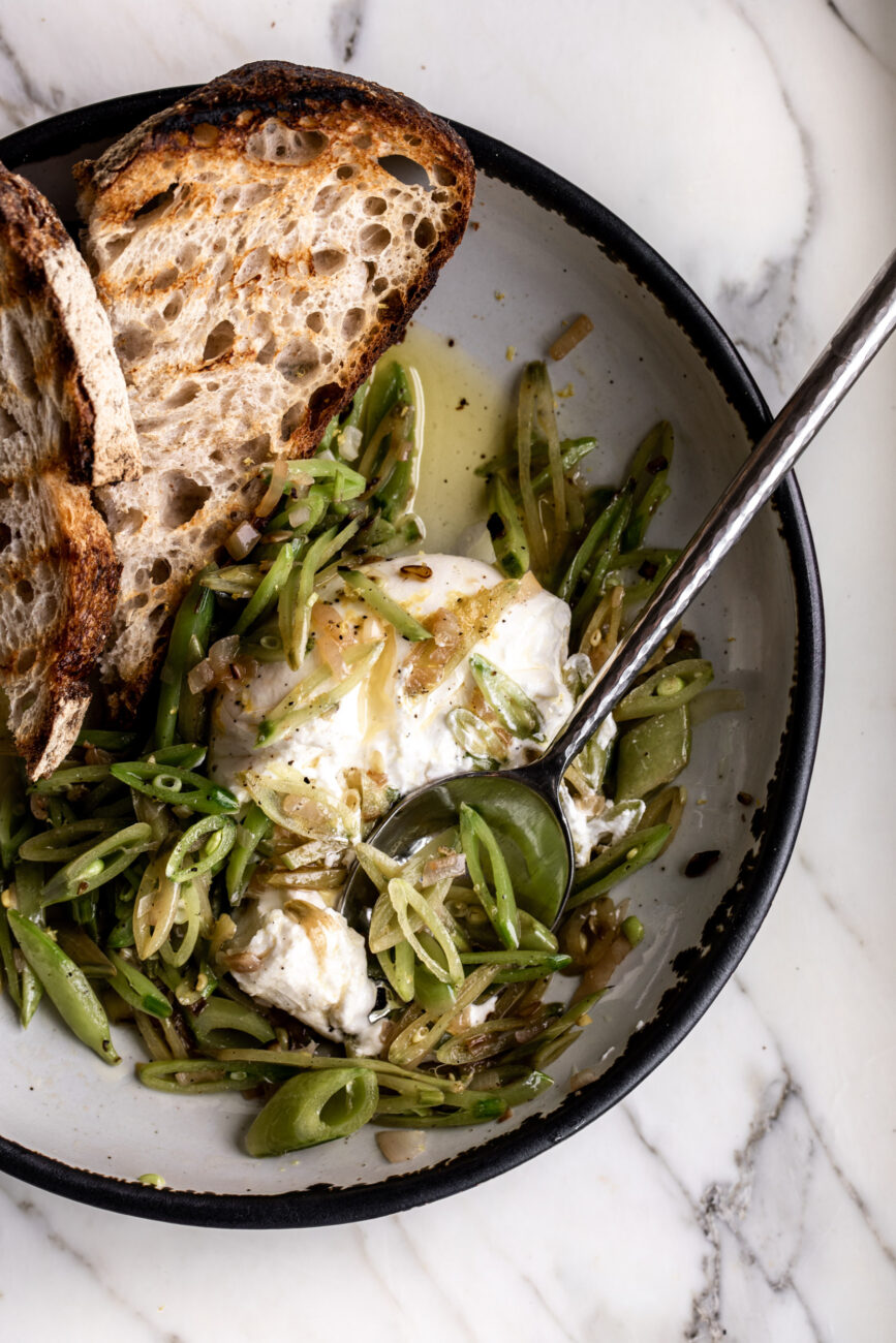 This sautéed pea salad with burrata pairs well with grilled proteins, crusty bread, antipasti, or as part of a spring spread.