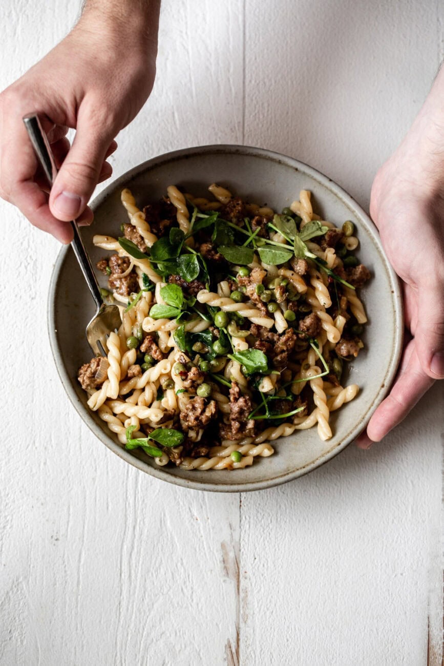 This spring lamb pasta with peas celebrates seasonal spring flavors with tender ground lamb, sweet English peas, fresh herbs, and a light, lemony sauce tossed with al dente pasta. The lamb adds savory richness, while the bright peas and herbs bring freshness that makes this pasta perfect for spring or Easter dinner. Serve with grated Parmesan for an elegant, flavorful meal that highlights simple ingredients. If you enjoy the deep flavor of lamb, try my lamb sausage pizza with confit tomatoes for your next pizza night or whip up these lamb meatballs (and be sure to freeze some for later!).